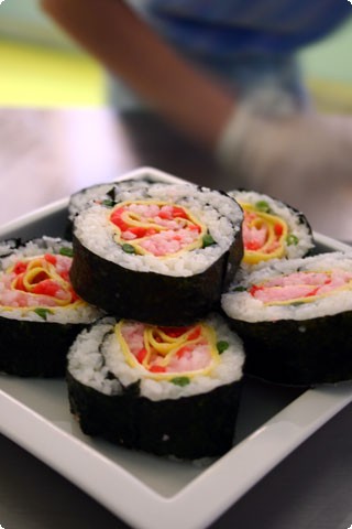 allora, le striscioline sono carota (visto giusto), frittata giapponese, rape rosse e fagiolini. vi rimetto nel post, fra due secondi, una diaporama della lezione ‘originaria’ in cui delle autentiche signore giap sono venute a insegnare questa arte del maki ceremoniale, con maki che sono addirittura due volti più grossi di questi qua…