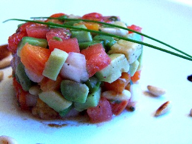La ricetta: sbucciare gli avocadi e tagliarli a dadini di 5mm, sbucciare gli aranci a vivo (togliendo anche le pellicine bianche) e tagliarli a dadini. Mettere l’avocado e l’arancio in una ciotola insieme al succo che l’arancio avrà perso durante l’operazione. Aggiungere il succo di limone, e un cucchiaio di dadini di pomodori fresco (sbucciato e privato dei semi). Salare e pepare abbondantemente. Tritare lo scalogno e l’erba cipollina e aggiungerli insieme anche ai pinoli. Tenere il tutto al fresco.