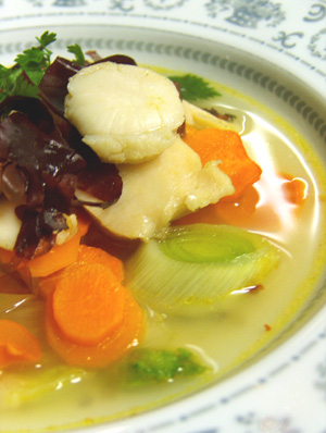 Filtrare il brodo di verdure, verificare il condimento. Rimettere il brodo sul fuoco. Dividere le verdure bollite nelle fondine, portare a ebollizione il brodo e cuocerci le capesanti per 5 secondi. Completare ogni piatto con le fettine di capesante e del brodo. Finire con le alghe e del cerfoglio.