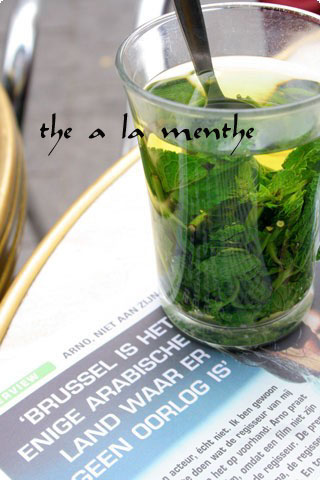 Ahum, dunque, dicevo, un paio di ora da spendere nella madre patria, il problema del ‘e adesso cosa facciamo che stiamo piantati qui come due mammalucchi’? è stato presto risolto: direzione Grand’Place, per uno spuntino da vero brusselear. Quindi eccovi due cartoline un pochino in ritardo… Sopra: la tartine au fromage blanc e ravanelli, abbinato a una gueuze (tempo fa ve ne ho pure dato la ricetta) eppoi, sotto, quasi altrettanto tipico, il thé à la menthe fraiche (che, come lo ricorda il graffianti titolo sul giornale sotto al bicchiere: Bruxelles è l’unico paese arabo dove non c’è la guerra – non è che io sottoscriva a questa provocazione eh, capiamoci bene ;-)