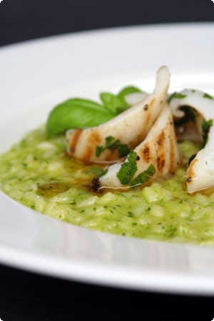 Mentre cuoce il risotto preparare le seppie: metterle a marinare, pulite e inere, con un po’ di olio e l’aglio tritato, per una decina di minuti, poi cuocerle sulla griglia caldissima (toglierle prima che diventino dure :-). Tagliarle poi a strisce, condire con un altro filo di olio, il succo di limone, il prezzemolo tritato, poco o niente sale e pepe. Versare il risotto nei piatti, completare con un po’ di seppia e servire.
